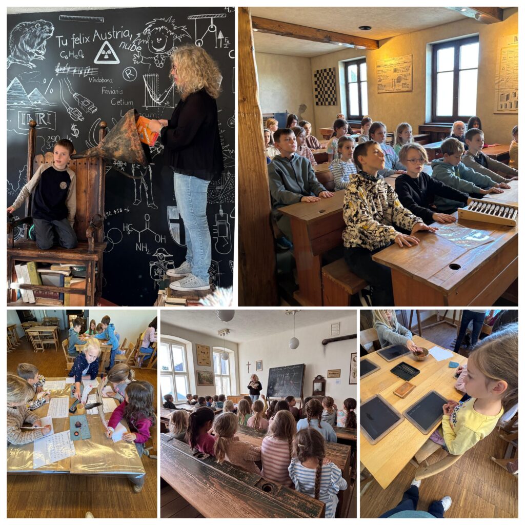 Die 3. Klasse besuchte im Herbst das Schulmuseum in Michelstetten. Dort durften sie entdecken, wie es vor über 100 Jahren in der Schule aussah. Im Anschluss an die Führung konnten sie noch mit alten Federn und Tinte schreiben, sowie auf Schiefertafeln die alte Schulschrift üben.